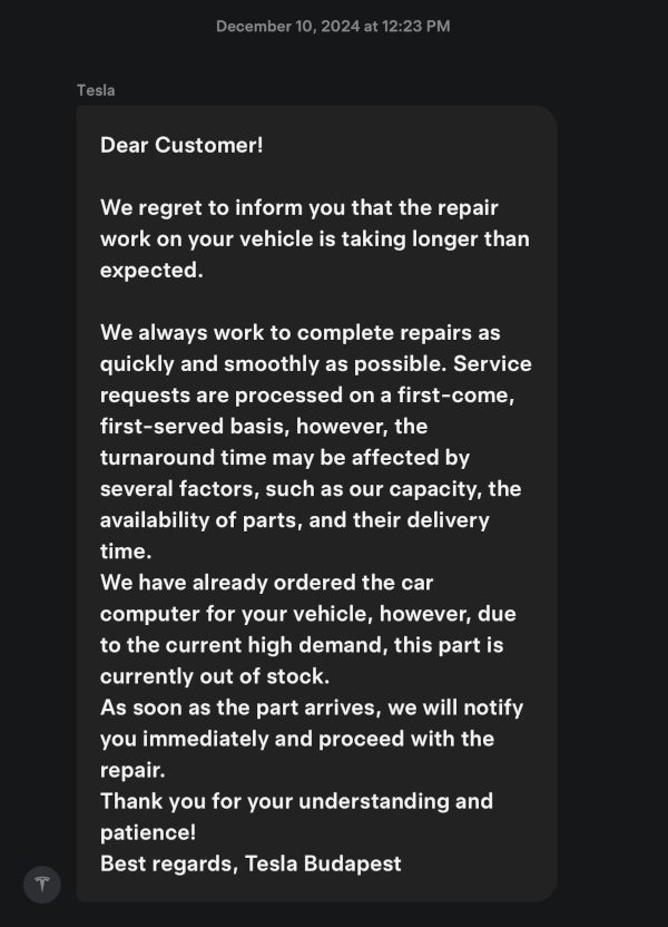On December 10, 2024, I received a response from the Budapest Service Center confirming the problems in the vehicle and that the on-board computer had to be replaced. As the article points out, they informed me that at the moment they did not have the part in stock and they did not know when it would be available.